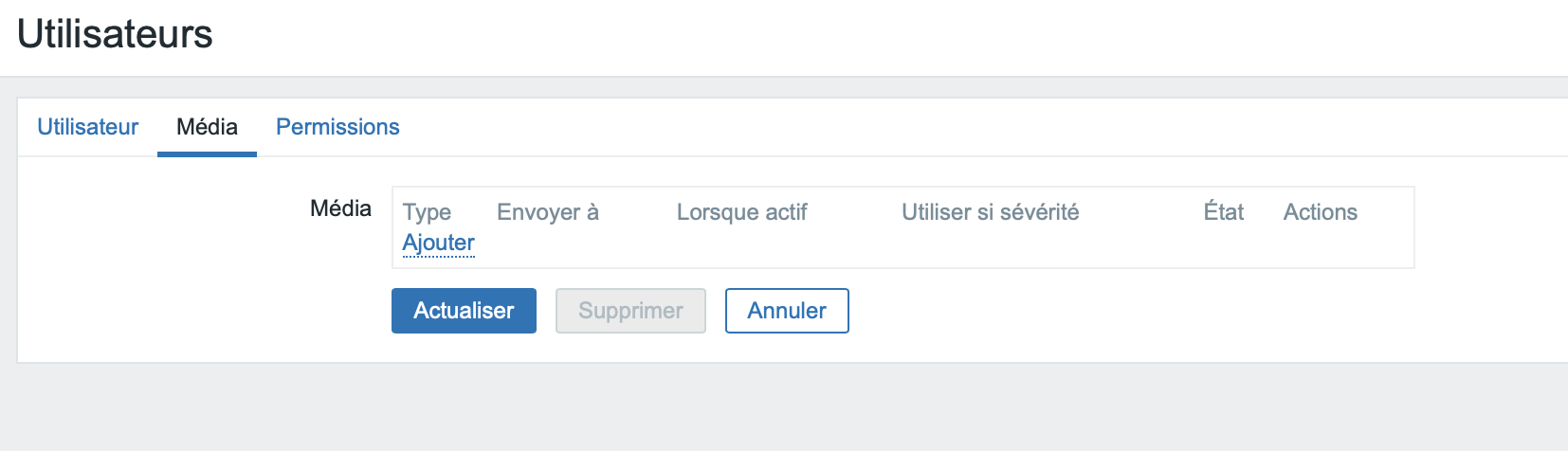 RajouterCréer unune média,nouvelle avec Type Emailation, et saisissezchoisissez l'emailvotre quihôte recevraet lesle alertes.déclencheur voulu, dans notre cas je prendrai comme example le serveur web et le déclencheur apache down.
