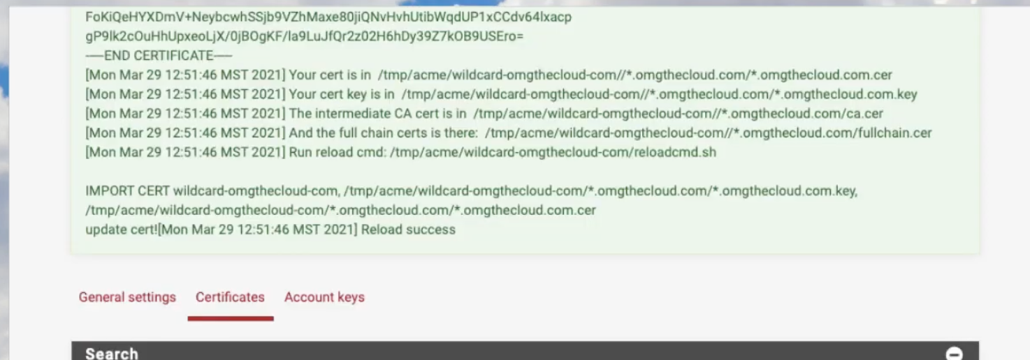 Après la validation, vous pourrez vous rendre sur System -> Certificate Manager -> Certificates et voir que le certificat à bien été configuré.