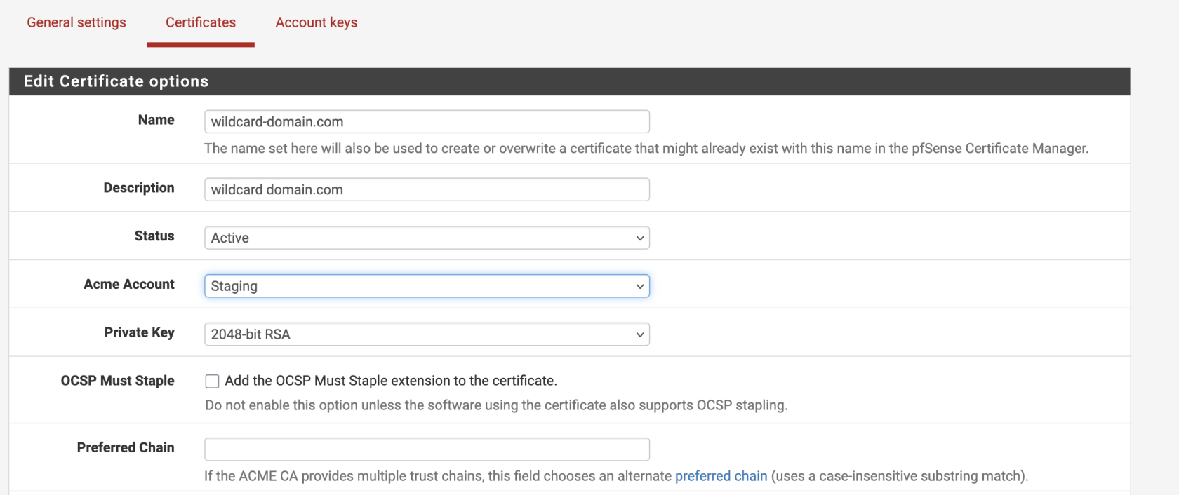 Pour le acme account choisissez le staging. Laissez le reste par défaut à moins que vous souhaitez l'ajuster selon vos besoins.