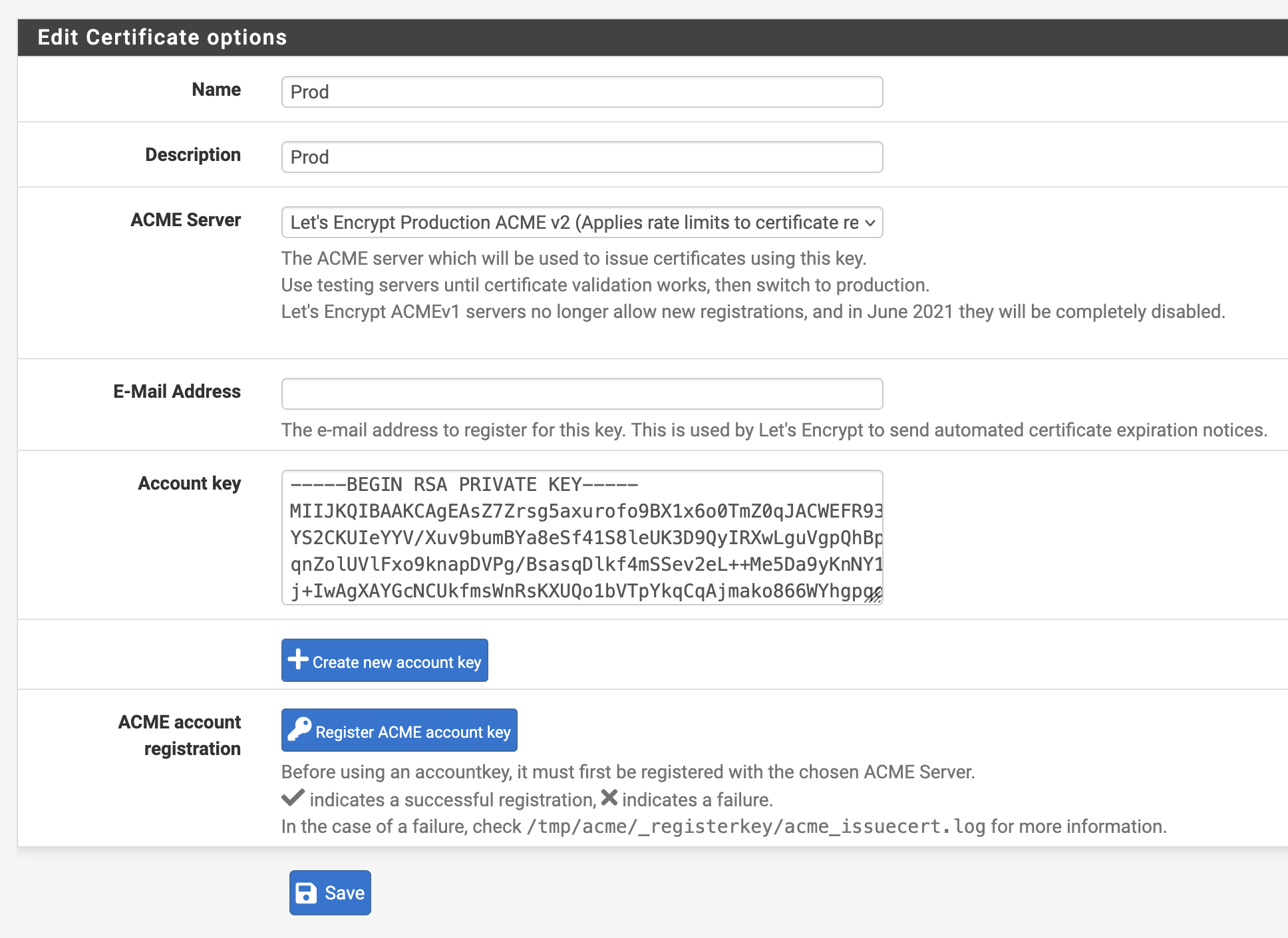 Lorsque vous hébergez un ou plusieurs site web sur votre réseau, il est possible de faire la gestion de certificat beaucoup plus facilement avec let's ecrypt grâce au paquet ACME de pfsense.