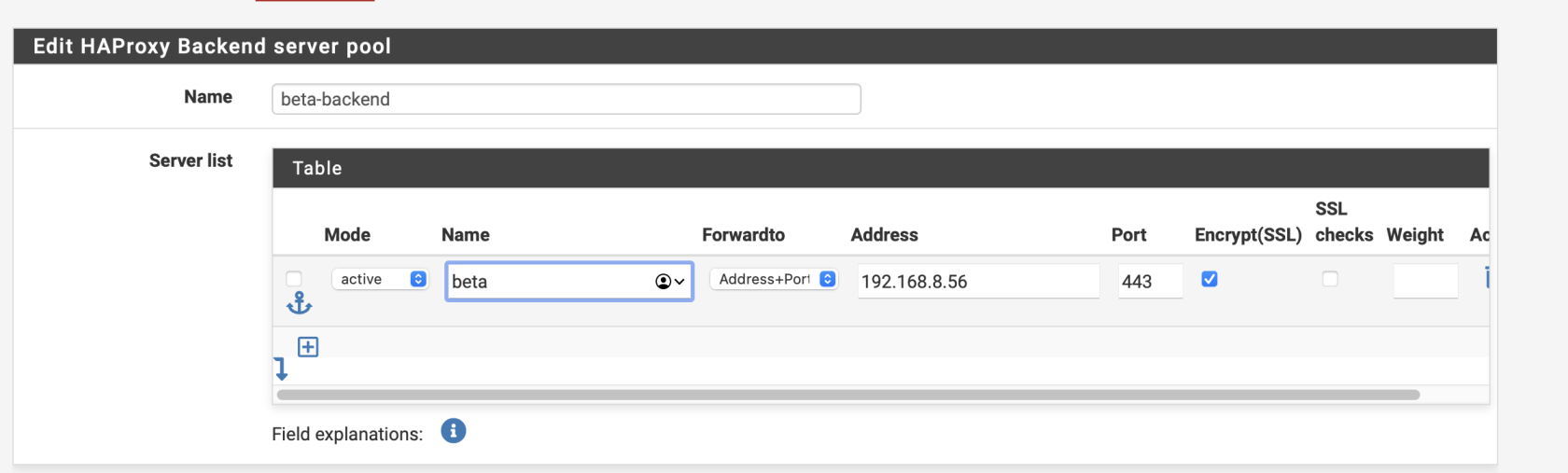 Au niveau de la section Server list rajoutez une règle, avec le même nom que le backend et le site (il est mieux d'uniformiser les noms pour ne pas se perdre, dans ce tuto nous faisons comme si le site web était beta.mondomaine.com)