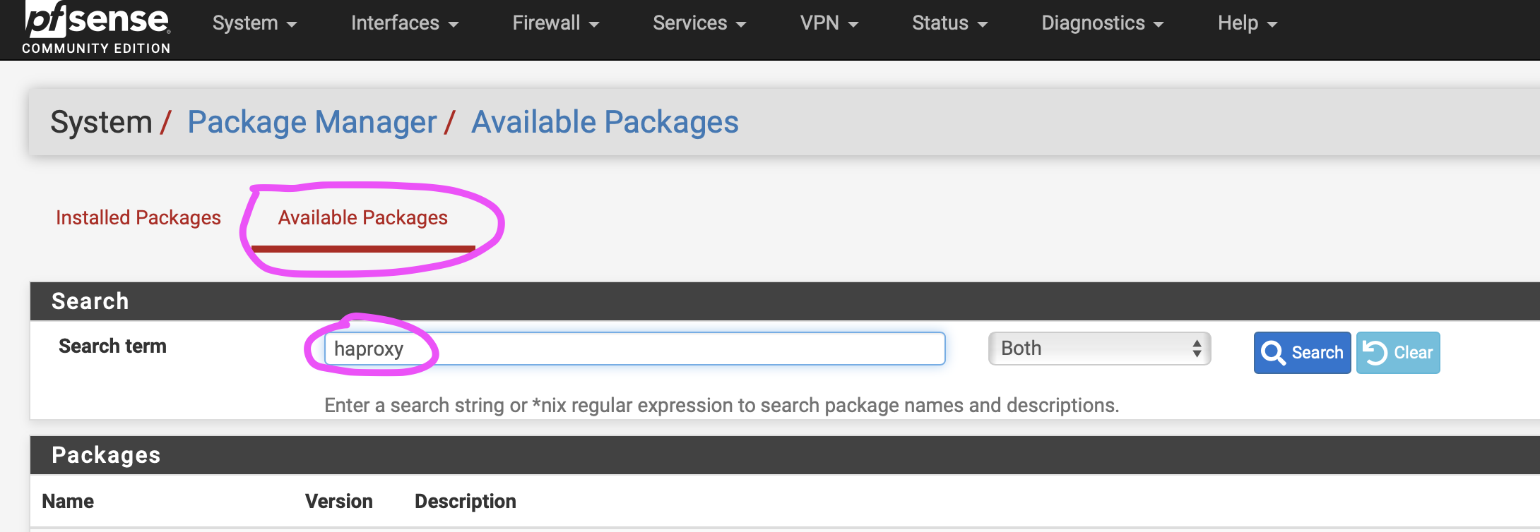 Aller dans le gestionnaire de pacquet pfsense et installer le pacquet HAproxy :