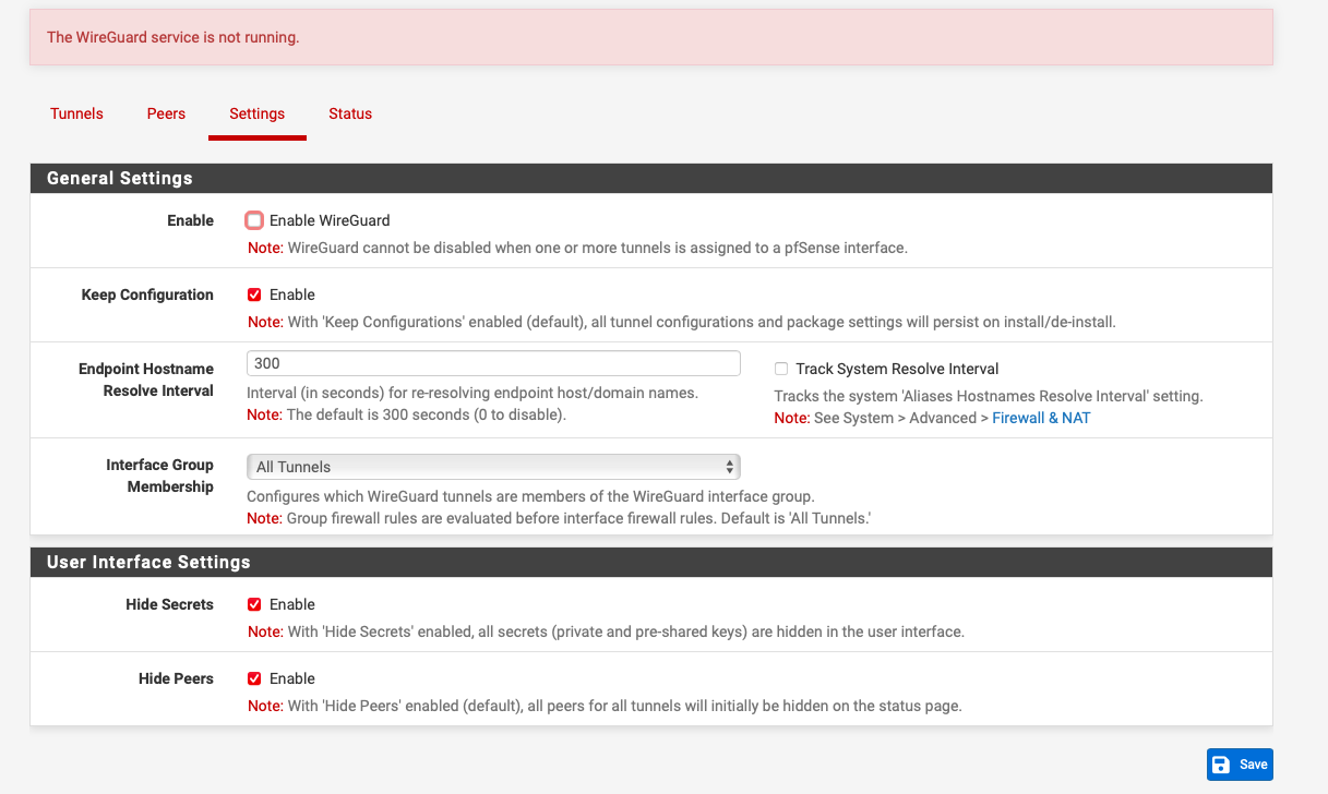 Retournez sur l'onglet Wireguard, dans l'onglet setting, cliquez sur enable pour activer le service. Vous pouvez laissez les autres paramètres par défaut ou les changer selon vos attentes.