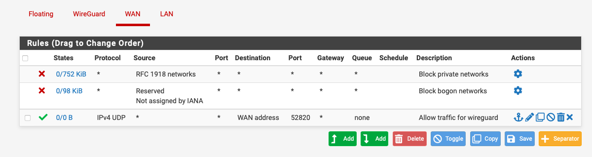 Sur la partie WAN, mettez une règle acceptant le traffic entrant vers le WAN en UDP sur le port 51820 (changez le port si vous l'avez changer lors de la création du tunnel).