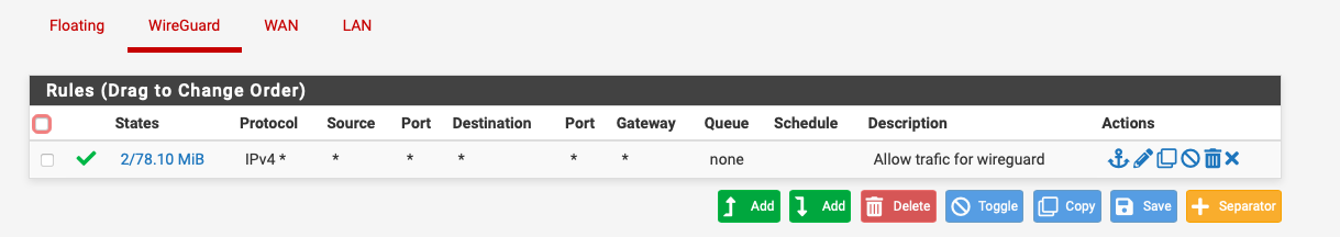 Sur la partie firewall sur pfsense, vous trouverez un onglet WireGuard automatiquement créer, acceptez le trafic entrant et sortant sur n'importe quelle port,