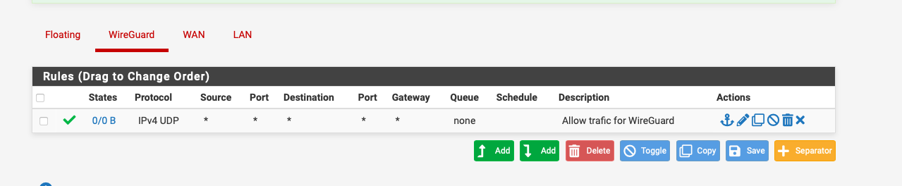 Sur la partie firewall sur pfsense, vous trouverez un onglet WireGuard automatiquement créer, acceptez le trafic entrant et sortant sur n'importe quelle port, la règle ressemblera à ça :